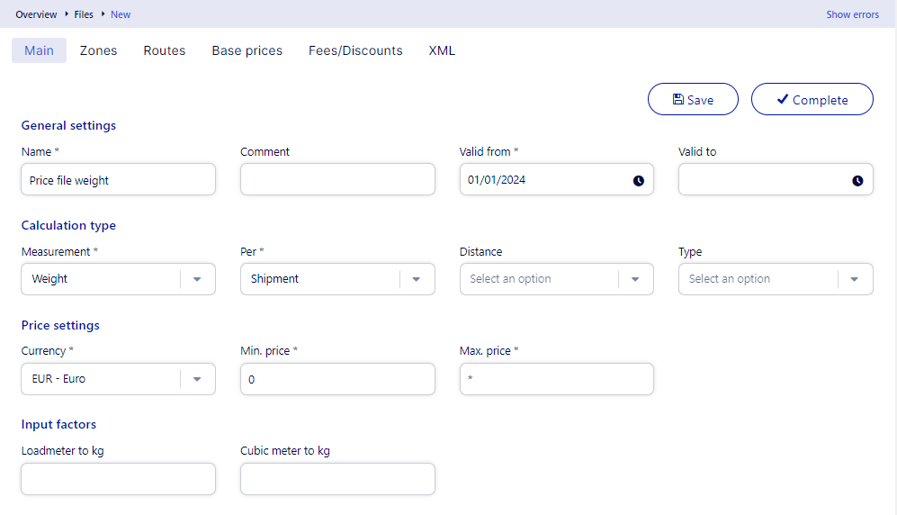 - Editoren åbnes i fanen Main, som er opdelt i følgende sektioner: General settings, Calculation type, Price settings og Input factors.