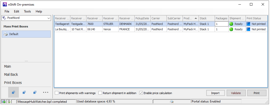 - Klik på Print for at starte udskrivning af alle labels. Efter udskrivning ændres Print Status fra blå Not Printed til grøn Printed, og forsendelserne vil være tilgængelige i Outbox til afsendelse.