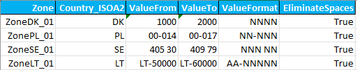 ValueFrom og ValueTo kan bruges til at angive et postnummerinterval, for eksempel 1000-2000. Hvis zonen ikke er et interval, men et specifikt postnummer såsom 1234, indtaster du blot 1234 i både ValueFrom og ValueTo. Bemærk, at du ikke kan have det samme postnummer repræsenteret to gange i samme land. Dette vil få prisservicens opslag til at fejle og give en fejl.
