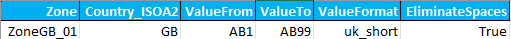 Postnumre i Storbritannien er lidt anderledes end i de fleste andre lande, derfor findes der et særligt ValueFormat kaldet "uk_short", som kan bruges. Britiske postnumre starter normalt med 1 eller 2 bogstaver efterfulgt af et tal. Eksempel 2 viser et postnummerinterval i Storbritannien ved brug af dette særlige format.