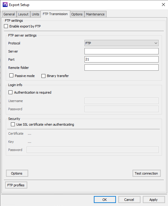 Fanen FTP Transmission giver dig mulighed for at sende eksporterede filer direkte til en anden server; du starter med at markere feltet "Enable export by FTP" for at aktivere funktionen. Herefter konfigurerer du serverindstillingerne i sektionen "FTP Server Settings". Dette indebærer valg af protokol (såsom FTP eller SFTP), indtastning af serveradresse og portnummer, angivelse af den eksterne mappe på serveren, hvor filerne skal uploades, samt valg af passiv tilstand eller binær overførsel, hvis nødvendigt.