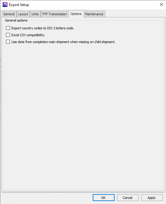 Fanen Options tilbyder flere generelle indstillinger til finjustering af eksportprocessen. Du kan vælge at eksportere landekoder ved hjælp af ISO 2-bogstavsstandarden ved at markere feltet "Export country codes to ISO 2 letters code".