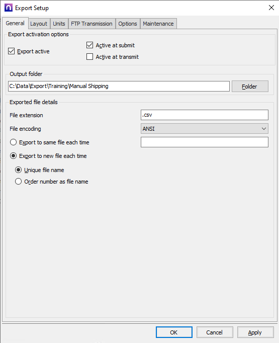 Fanen General giver dig mulighed for at aktivere eller deaktivere eksportfunktionen helt ved hjælp af afkrydsningsfeltet "Export active"; dette skal være markeret, for at eksporten fungerer.