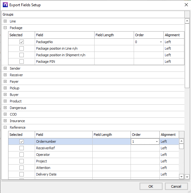 For at definere separatorer og afgrænsere skal du starte med at vælge de felter, du vil eksportere. Dette gøres i vinduet "Export Fields Setup", hvor du kan vælge datapunkter fra kategorier som Line, Package, Sender, Receiver med mere. I dette vindue kan du vælge de felter, du har brug for, arrangere deres rækkefølge og eventuelt angive faste feltlængder.