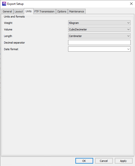 Dette afsnit giver dig mulighed for at angive måleenheder og datoformater, der skal anvendes i de eksporterede data. Fanen Units fokuserer på at sikre datakonsistens ved at lade dig vælge de relevante enheder for vægt, volumen og længde fra rullemenuer.