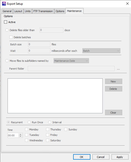 Fanen Maintenance giver dig mulighed for at automatisere filhåndtering. Først skal du aktivere vedligeholdelse ved at markere feltet "Active". Derefter kan du konfigurere indstillinger til at slette filer ældre end et bestemt antal dage, slette filer i batches af en bestemt størrelse og angive en ventetid mellem batchsletninger.