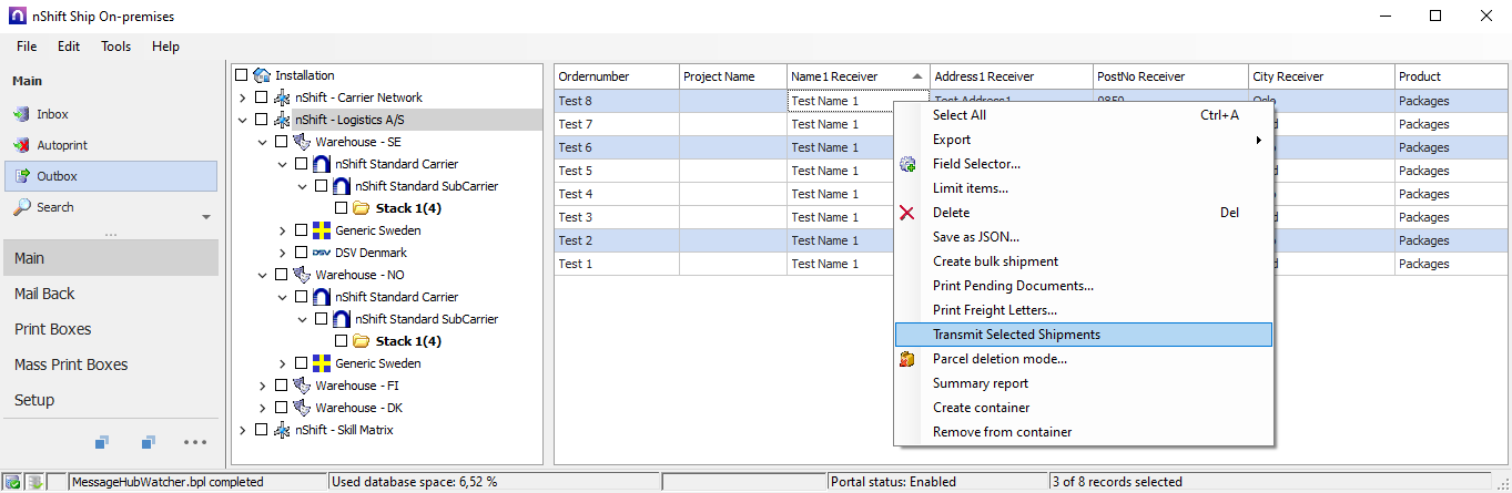 Normalt, efter import af forsendelsesdata, går du til Udbakken, vælger en stak eller flere forsendelser, højreklikker og vælger "Transmit Selected Shipments". Dette genererer og sender EDI til transportøren.