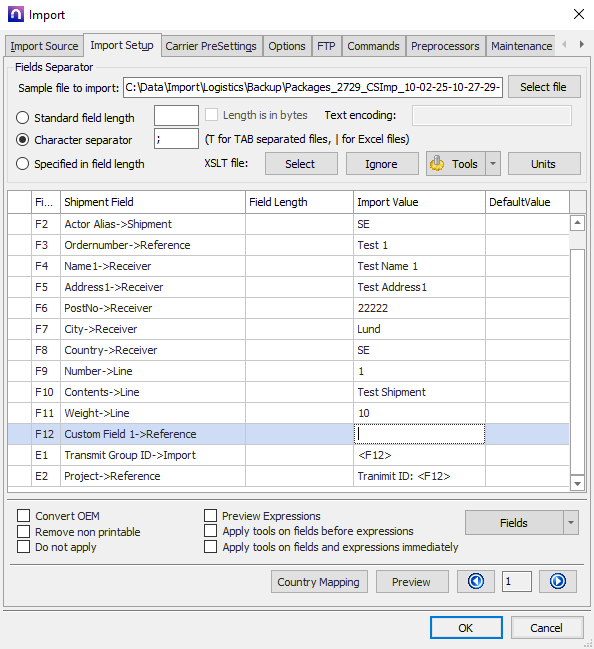 "Packages";"SE";"Test 1";"Test Name 1";"Test Address1";"22222";"Lund";"SE";"1";"Test Shipment";"10"