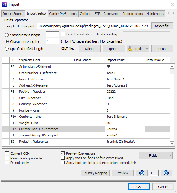 "Packages";"SE";"Test 1";"Test Name 1";"Test Address1";"22222";"Lund";"SE";"1";"Test Shipment";"10";"RouteA"