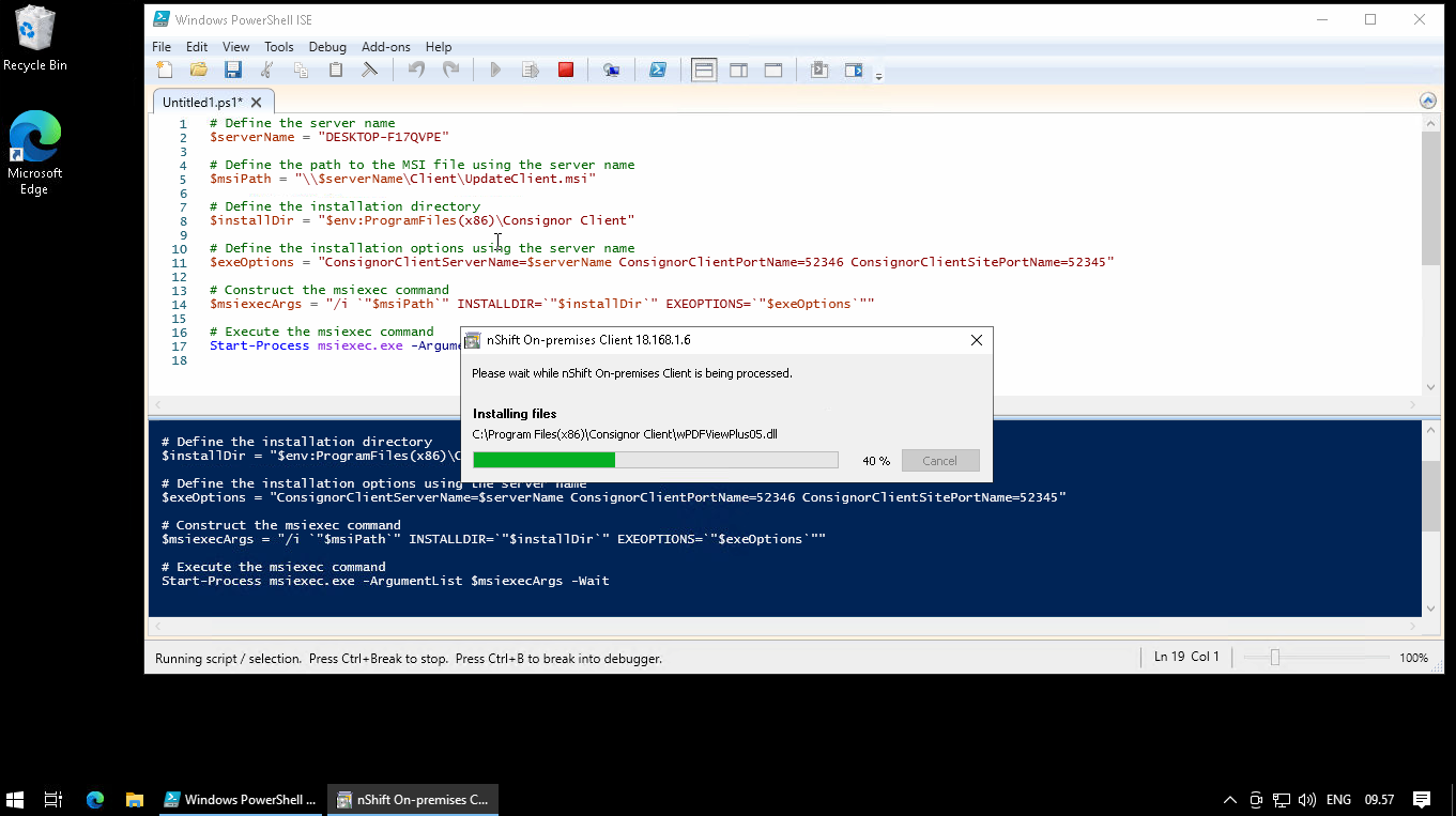 Denne artikel beskriver, hvordan man udfører en stille, on-premises installation af nShift Client ved hjælp af et PowerShell-script. Scriptet bruger Windows Installer (msiexec.exe) til at udføre installationen stille, hvilket undgår behovet for manuel brugerinteraktion.