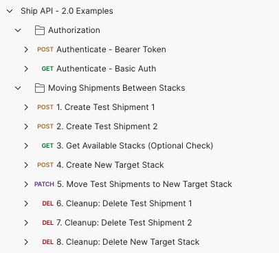 DELETE /shipServer/{{ID}}/shipments/:shipmentTag) og den nyoprettede stack (DELETE /shipServer/{{ID}}/stacks/:stackCSID). - Hvorfor: For at fjerne midlertidige testdata fra systemet efter verifikation af flytteoperationen.