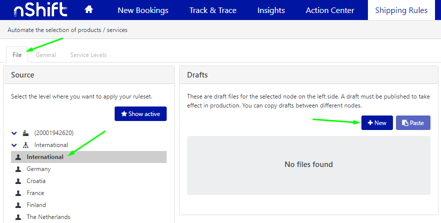 - Gå til Shipping Rules > File > Drafts og klik på knappen New.
