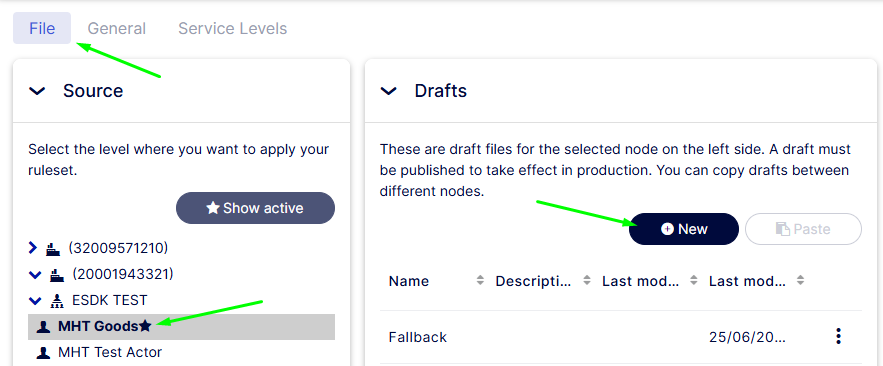 - Gå til fanen General og find din fil under Drafts. Klik på menuen med tre prikker og vælg Publish. Filen er nu aktiv og vil blive brugt næste gang, du opretter en forsendelse.