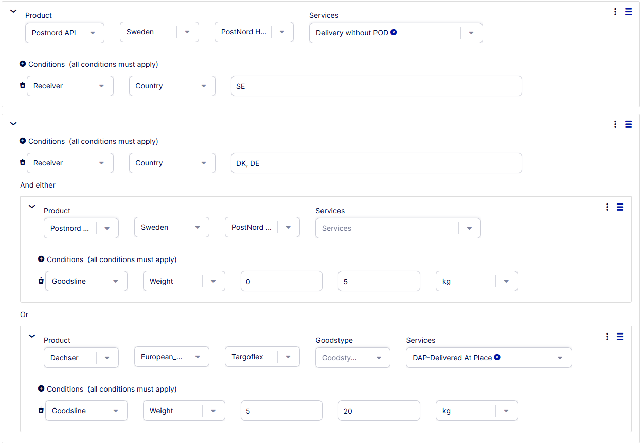 - Klik på menuen med tre prikker på niveauet for modtagerland DK, DE, og tilføj endnu en underregel. Dette definerer produktet, der skal bruges til tungere pakker. I dette eksempel bruger vi Dachser > European Logistics > Targoflex og vælger godstype Box samt service DAP-Delivered At Place.