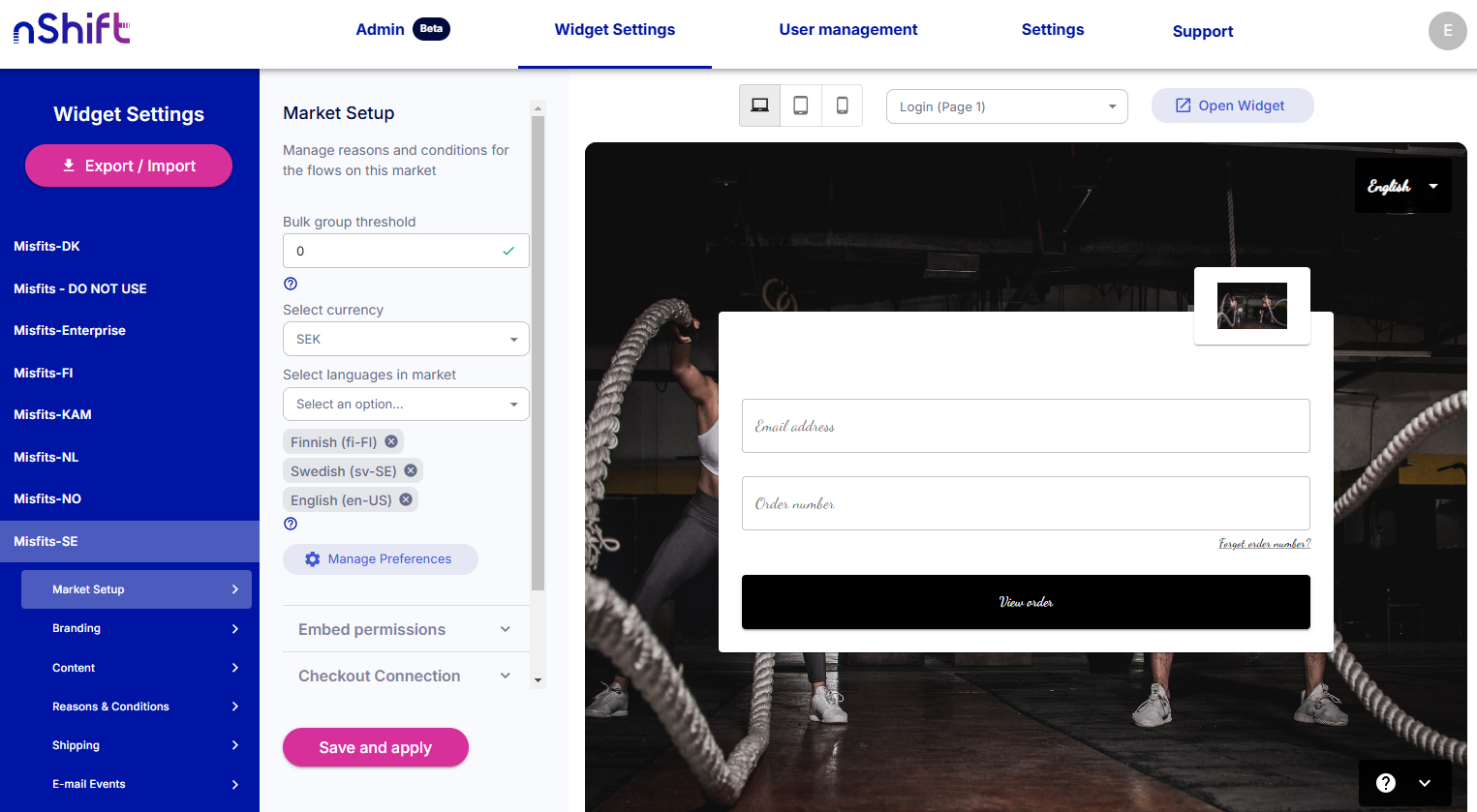 - Go to Market Setup. Select the currency and language you want for your returns page. You can enable as many languages as you want for a market but only one currency. After a language has been enabled, you can add content to it under Content and E-mail Events. The value of the Bulk group threshold field specifies how many identical items in an order can grouped and returned as one bulk.