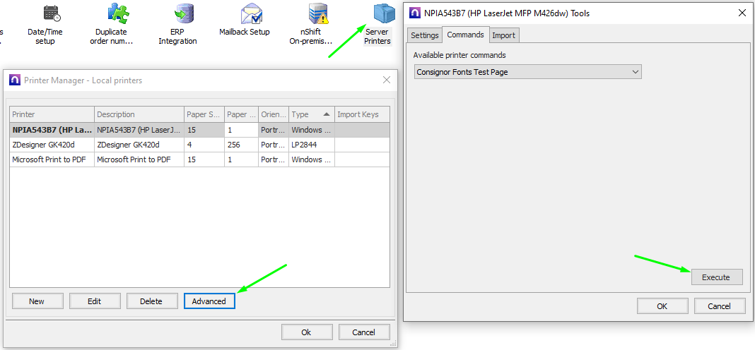 - Choose Consignor Fonts Test Page in the tab Commands and click Execute.