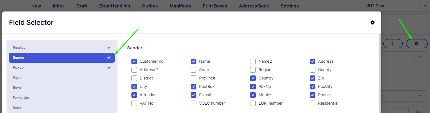 If your Sender tab or some of the address fields are not visible, click the action wheel and make sure the appropriate fields are checked. Click Save to save your configuration.