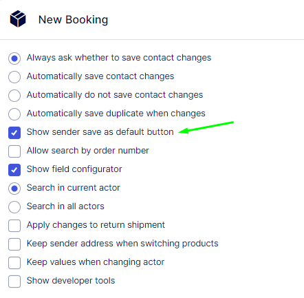 - Go to Ship > Configuration >Settings and check the box next to Show sender save as default button, located under the New Booking section.