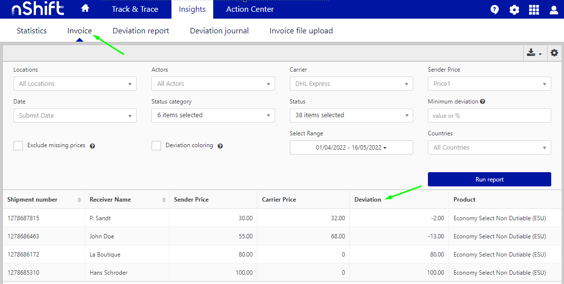 Use the invoice report to see deviations between the sender price and the price from the carrier. The sender price is the shipment price from freight rate calculation. The carrier price is based on carrier return data sent directly from the carriers to nShift Track or carrier invoice files uploaded to nShift Portal.