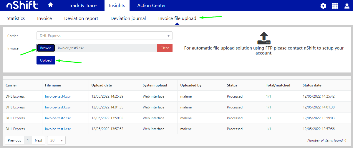 - Log in to nShift Portal and go to Track > Insights > Invoice file upload.