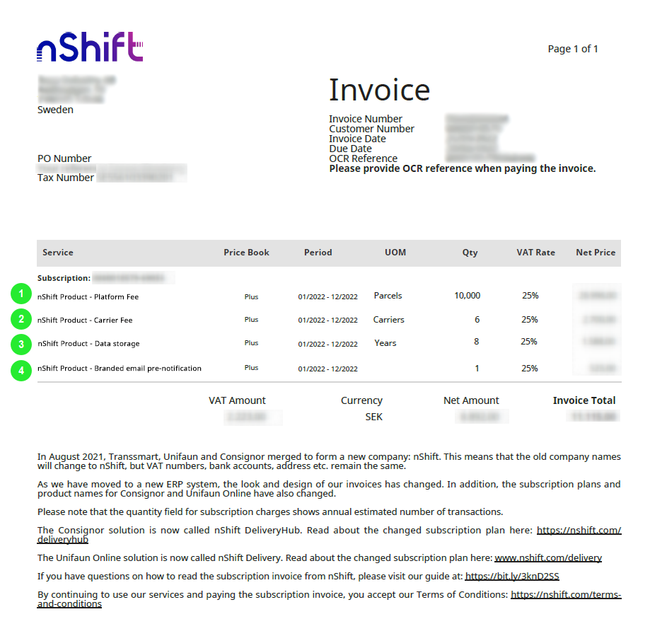 This article will help you understand your subscription invoice from nShift (former Consignor, Transsmart, and Unifaun). Below you will find an example of an invoice and a description of what the specific invoice lines cover.