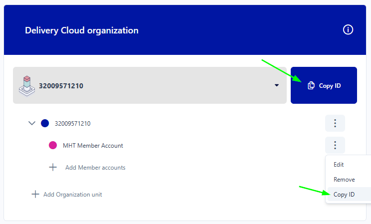 - Remember to copy and store your Organization ID and Member Account ID since these values are needed for the API requests. Choosing Copy ID will copy the value to your clipboard.