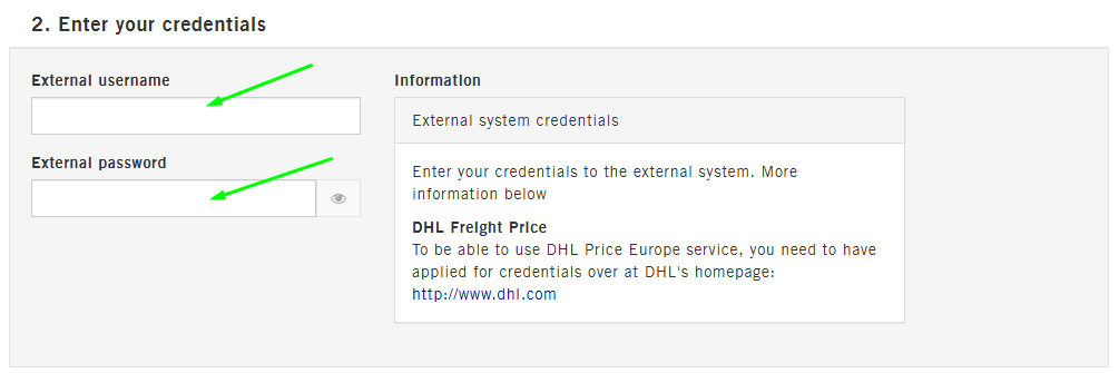 - Enter the e-ID in the External username field along with the password received from DHL.