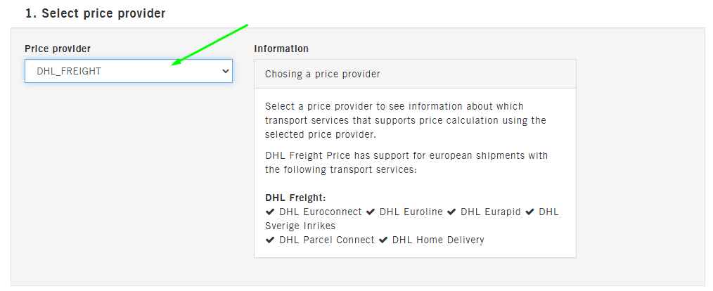 - Choose DHL_FREIGHT from the Price provider drop-down list.