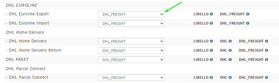 - Choose DHL_FREIGHT as the price provider for the products you are using, and click the Save button below the list of carriers.