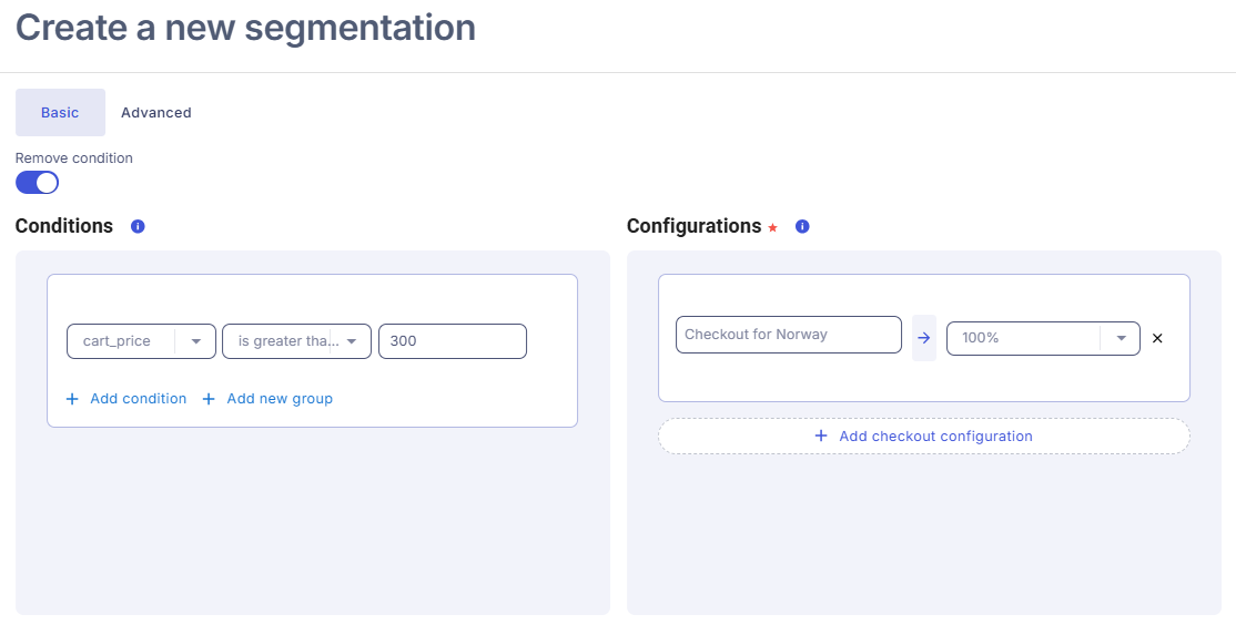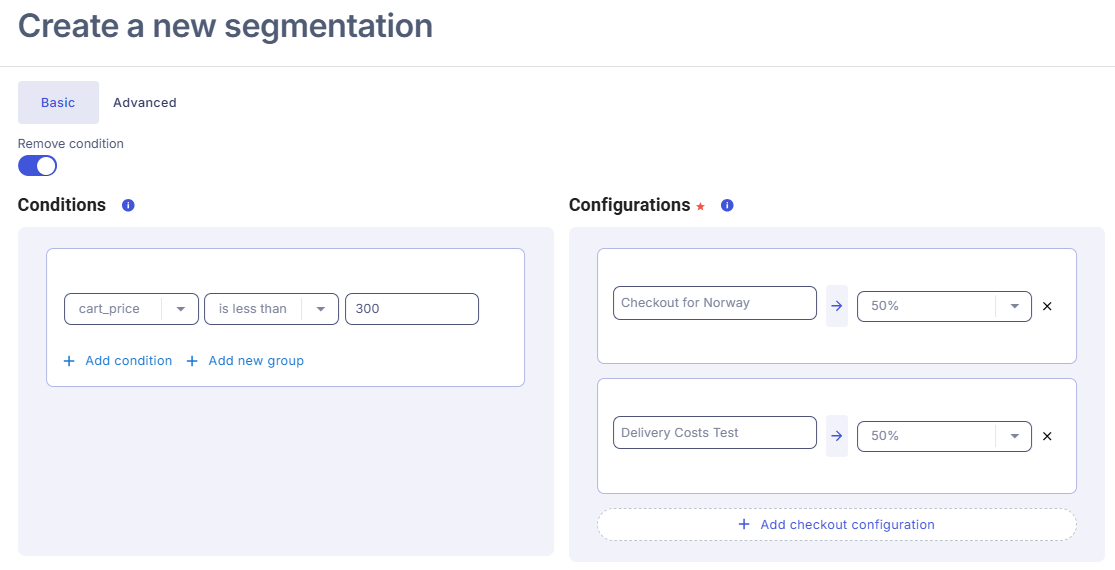 - Click Add new segmentation and activate the Add condition toggle. In this example, it is specified that if the cart price is less than 300 which is our free shipping threshold then 50% of traffic should be sent to the "Delivery Costs Test" configuration (the one we created above) and the other 50% should be sent to the "Checkout for Norway" (our default configuration).