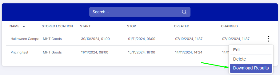 - Click the three-dot menu next to the experiment for which you want the results and choose Download Results.