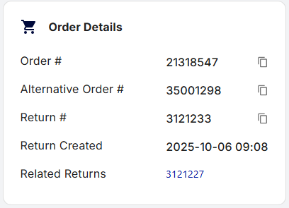 - Download Shipping Label: Click this button to download a shipping label for the return. If no label is generated this button will show "Generated shipping label"