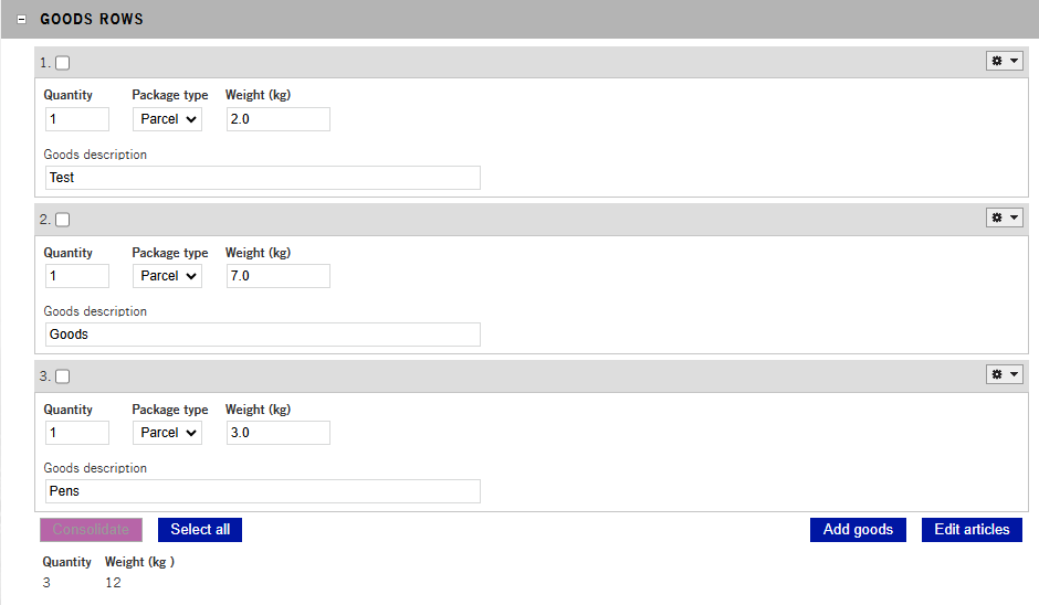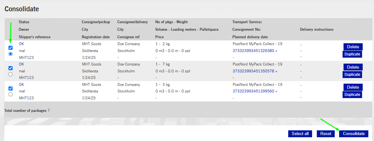 - Select the consignments you want to consolidate. Choose a master consignment by clicking the radio button
