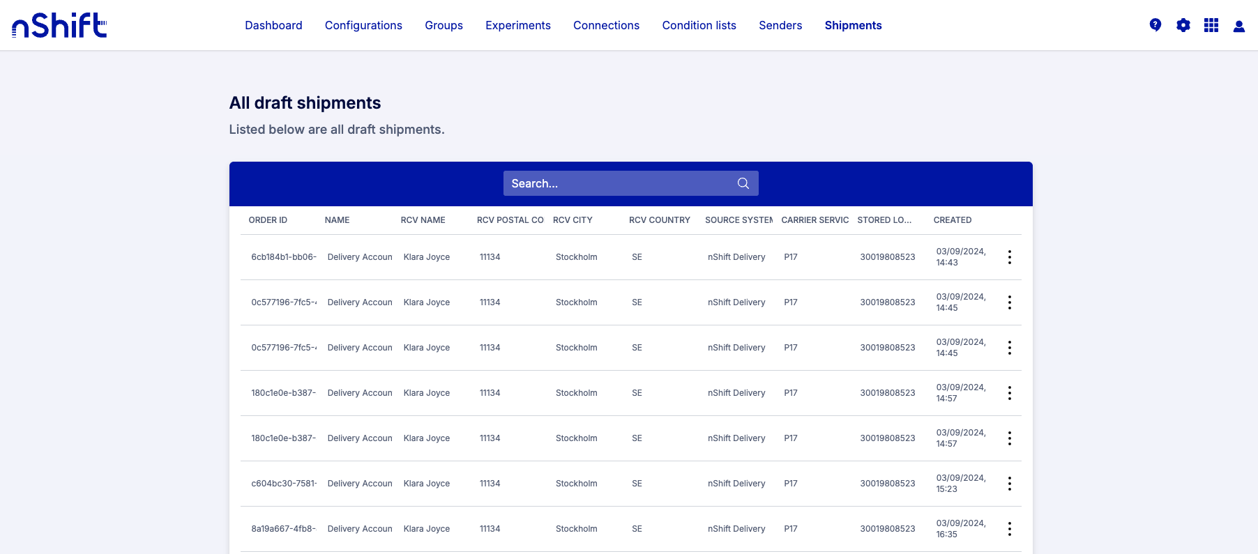 When clicking on a shipment row, the detail view opens.