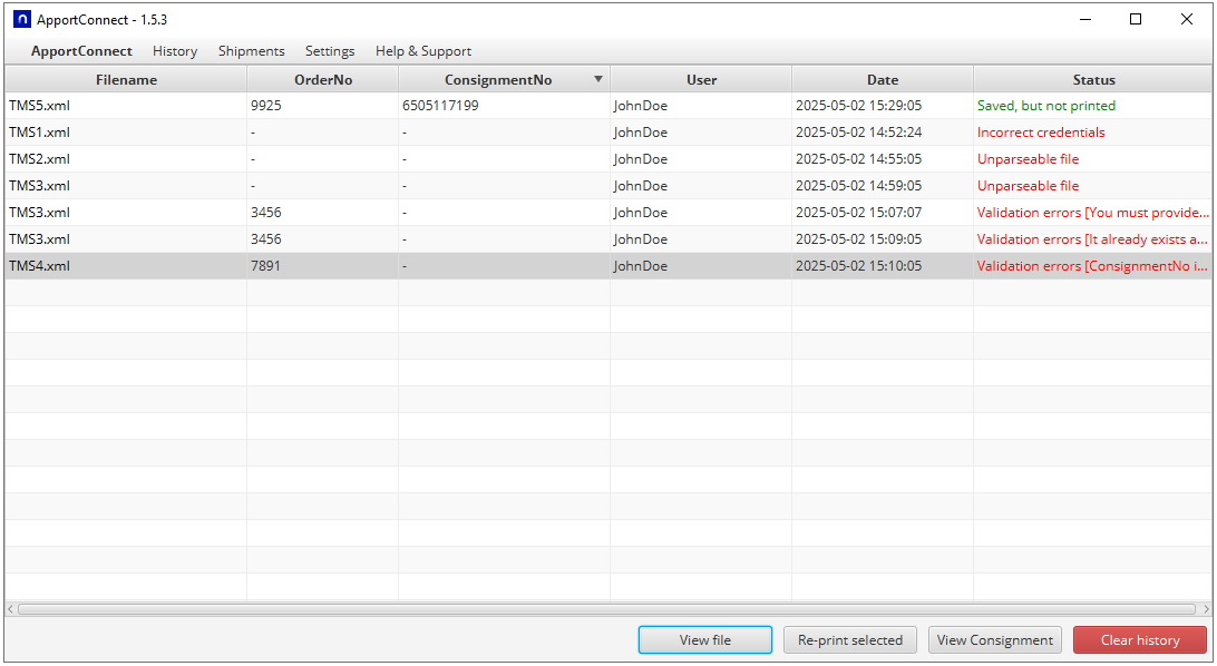 Upon discovering a new file in this folder, nShift ApportConnect sends the file to TMS using the domain, username, and password of the user monitoring the directory. The file is then validated, and if successful, one or more consignments are created from its contents.