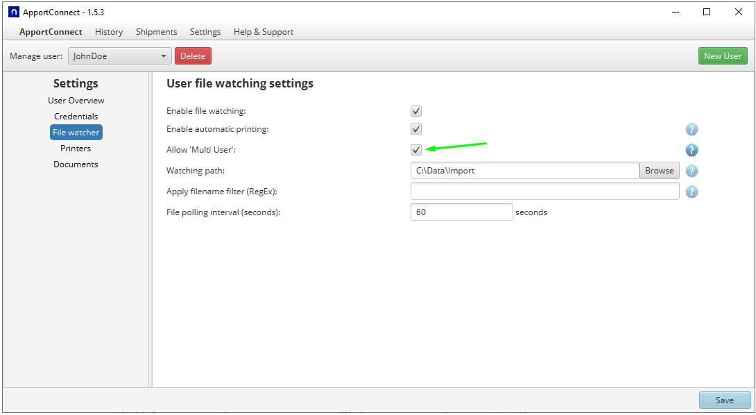 nShift ApportConnect is designed with the vision of having different users set up with their own printers. These users have their own watching paths and will send files found in their respective folders, while printing with their own printers.