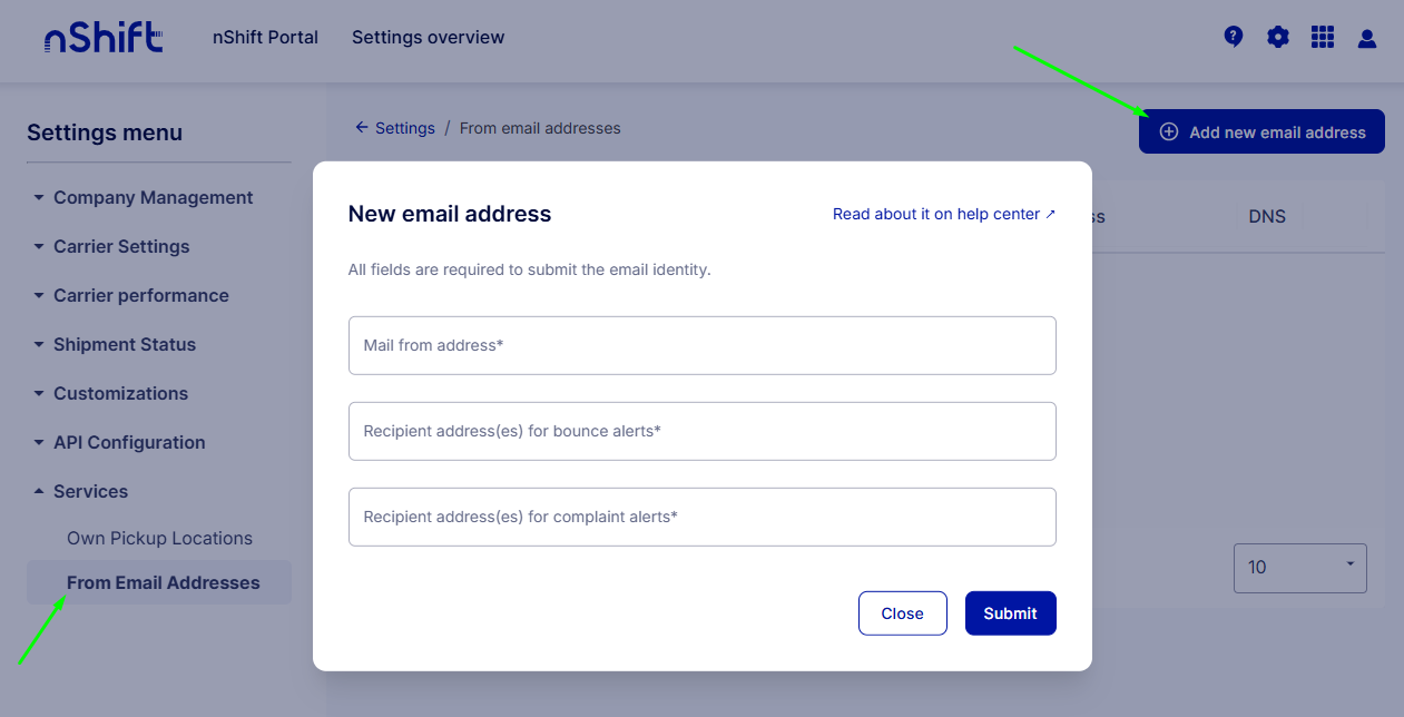 - Log in to nShift Portal and go to Settings > Services > From email addresses.