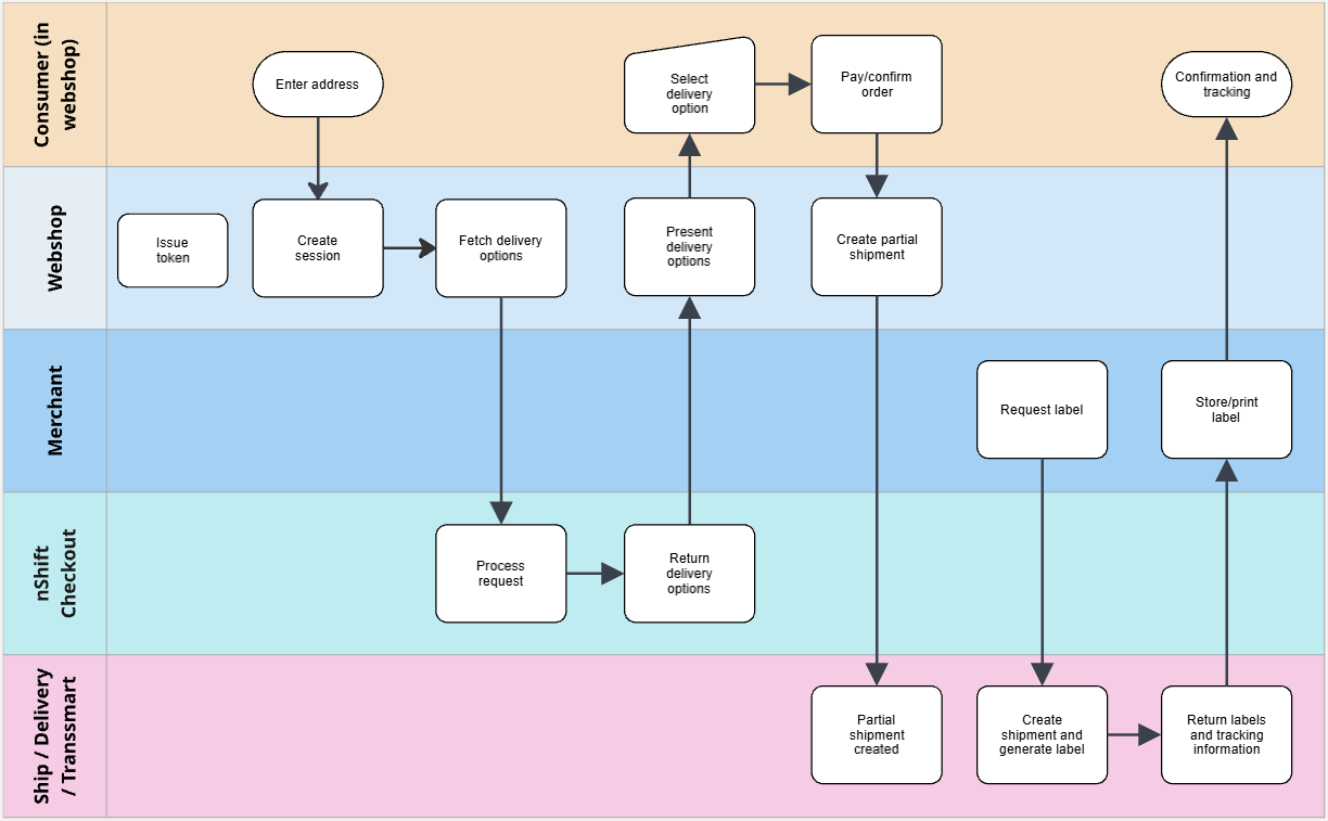 nShift Checkout flowchart Malene Tidemann Updated October 03, 2025 11:13 Read Mode This flowchart illustrates a Checkout integration using an nShift book and print product: Related articles Custom price look up from Transsmart Getting started with nShift Checkout API Prepared shipments Introduction to Shipment Server API Carrier ETA (estimated time of delivery)