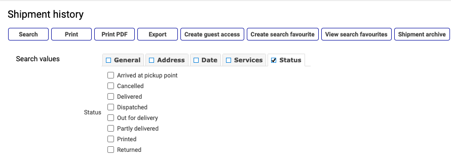 Tip: Check the Status box and select which statuses to search for to filter out shipments with a certain status.