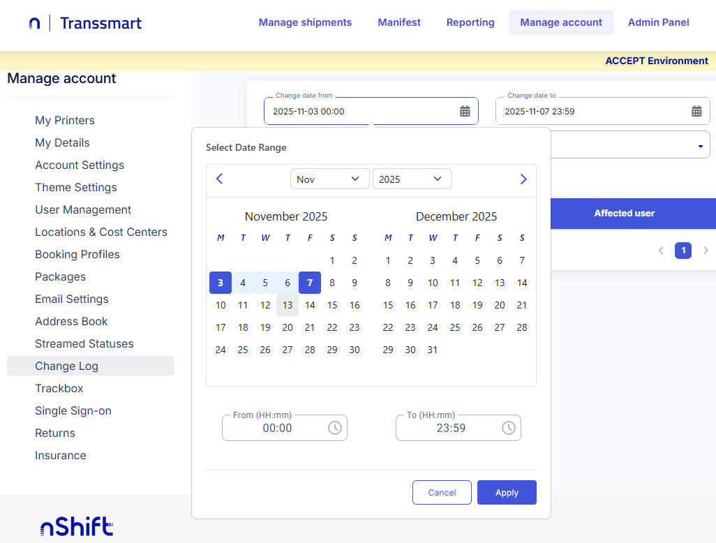In the Change Log page we have implemented a new date/time picker component which now makes it possible to also select the time from/time to in the filters.