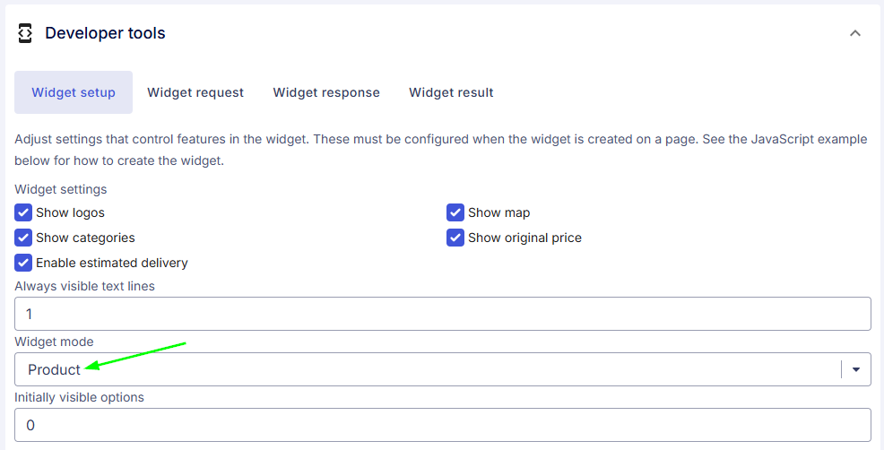 By setting the widget configuration parameter "mode": "product" (read more about widget integration) the widget loads in product mode, providing a simplified view optimized for product pages while maintaining the familiar delivery-option experience from the standard widget.