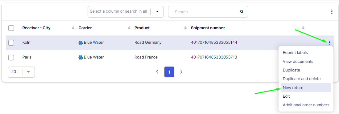 - Locate the relevant shipment and choose New return in the menu.