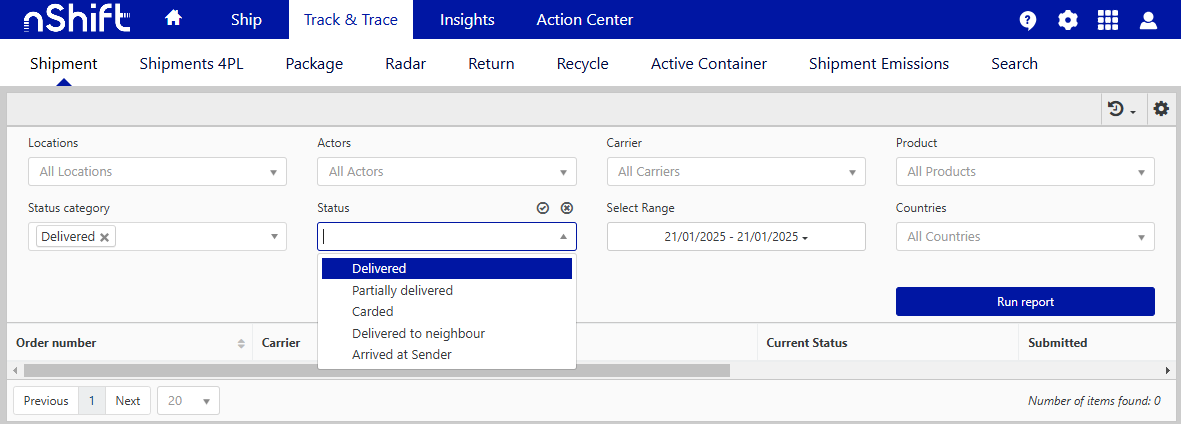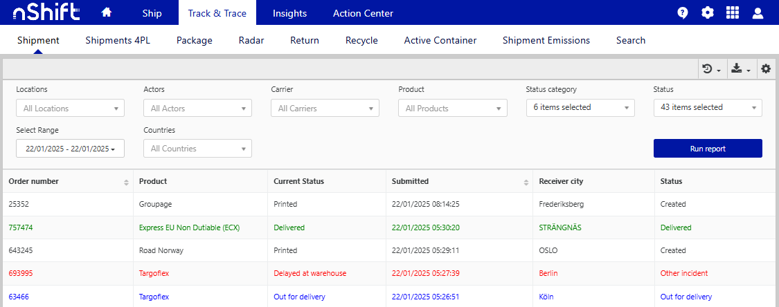 You can easily filter your Shipment, Package, Return, and Invoice reports under Track in nShift Portal using the shipment status filter. This tool lets you quickly view specific groups of shipments, like those delivered today or currently out for delivery.
