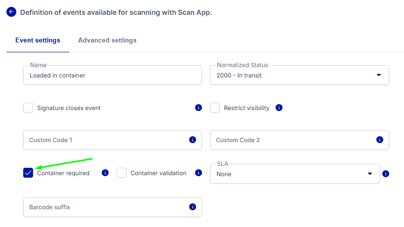 - Scan App will now validate if the event has the property Container required. If a container is required, a new screen will ask the agent to select a container. You can now either scan a barcode that will be used as the container, choose an available container from the list (if available) or create a new container.