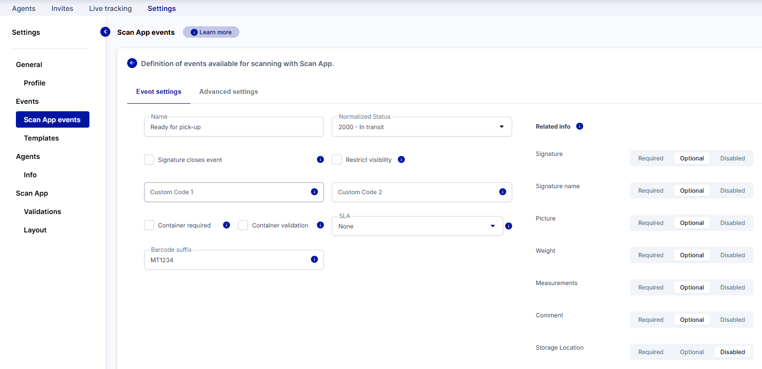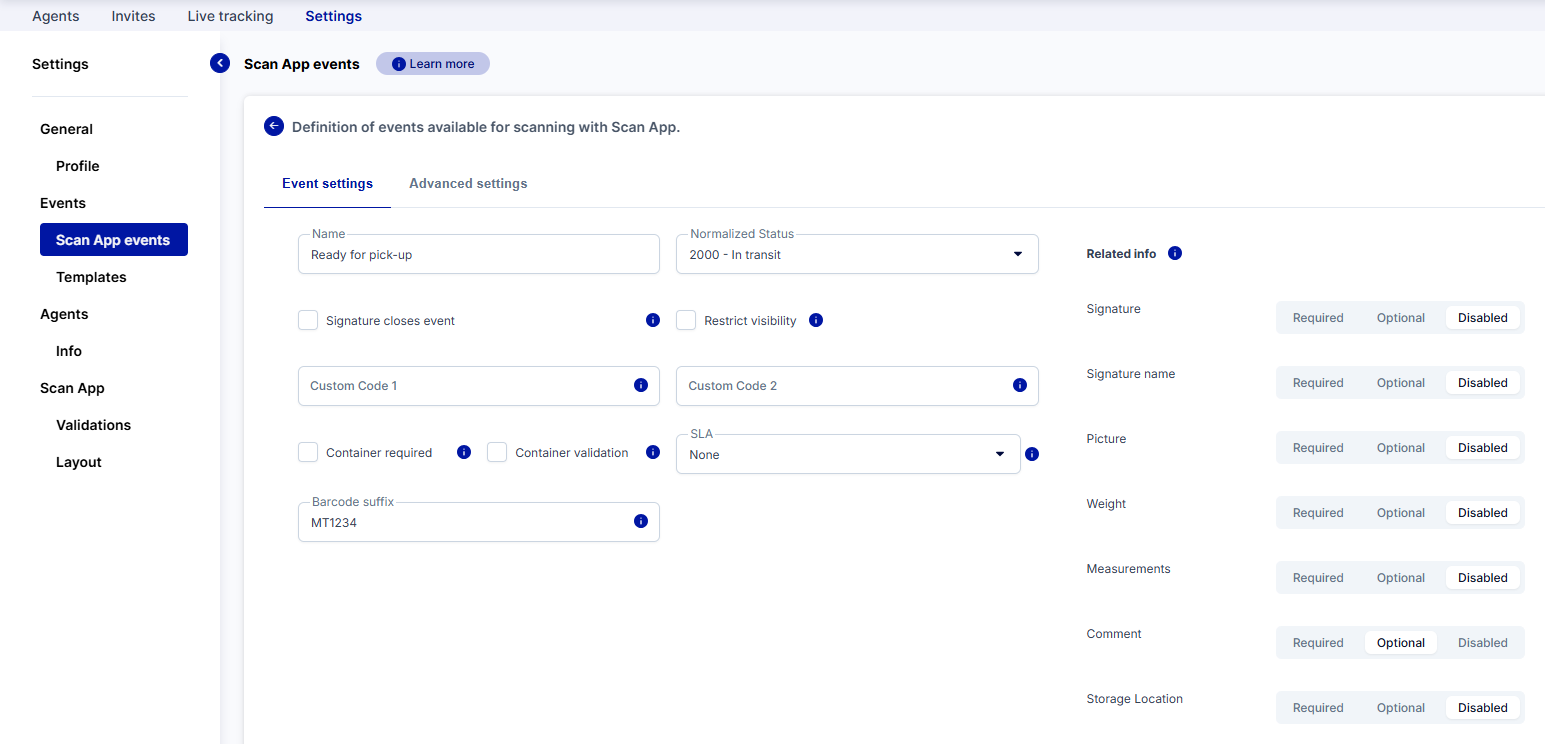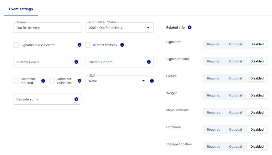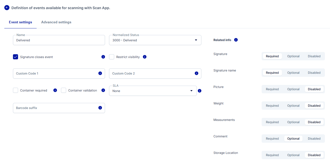 - We have named the event Out for delivery and selected a matching normalized status. In the Related info section, we have disabled all options. If the information is set to Optional or Required, you must tap through them in Scan App.