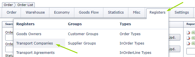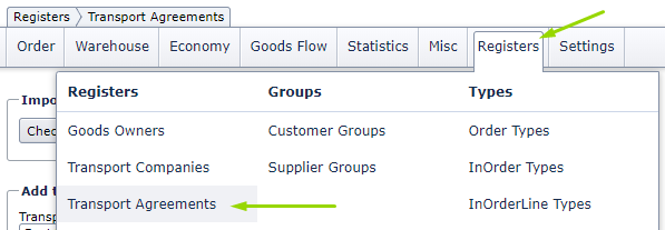 - Go to Registers > Transport agreements in the top menu.
