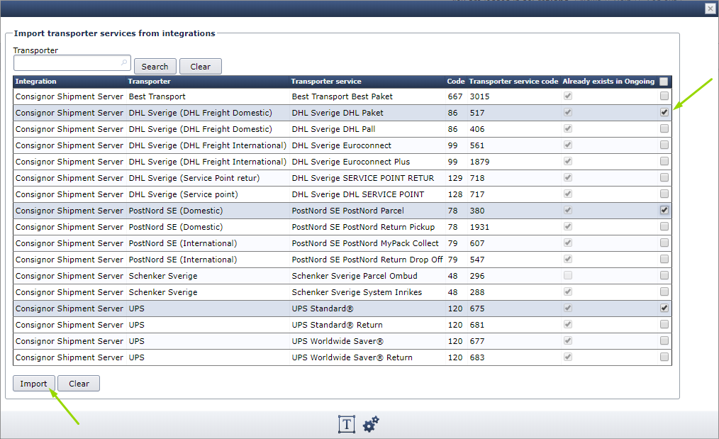 - A list is displayed with the subcarriers from nShift Ship. Select the ones you want to import by checking the checkboxes to the right, scrolling down, and clicking the Import button.