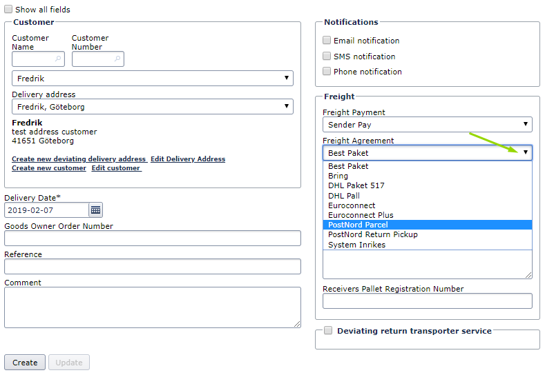 - Choose the correct carrier in the drop-down menu under Freight Agreement.
