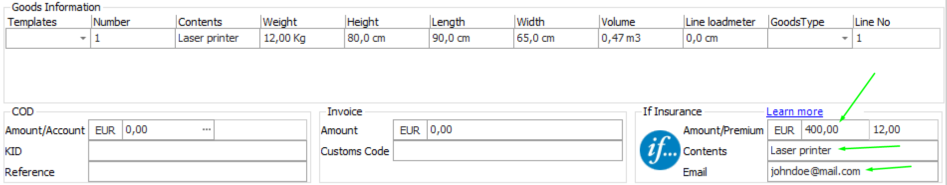 - Below the Goods information, you will find an If Insurance box. Fill in Amount, Contents and Email. The premium is automatically calculated based on the amount.