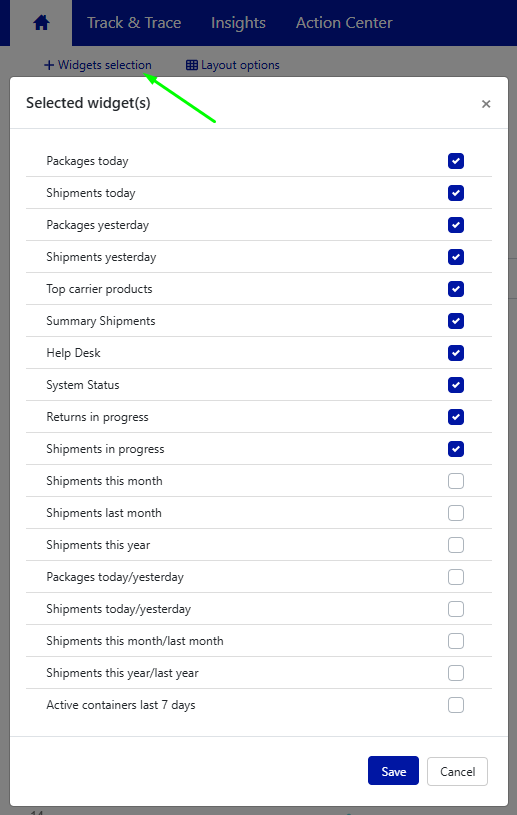 - Click the Widget selection link and select or deselect the widgets you want to be displayed.